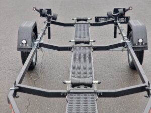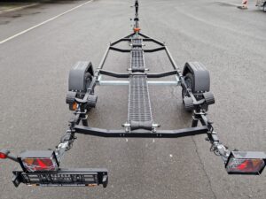 Der Rahmen besteht aus feuerverzinktem Stahl mit schwarzer Pulverbeschichtung und ist vollständig verschweißt. Dies gewährleistet eine hohe Stabilität, Langlebigkeit und einen wirksamen Korrosionsschutz – auch bei regelmäßigem Kontakt mit Wasser. Die verbaute, verschiebbare Gummifederachse von AL-KO oder KNOTT mit wasserdichten WPS-Kugellagern ermöglicht eine präzise Gewichtsverteilung und sorgt für ein sicheres, ruhiges Fahrverhalten.