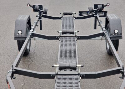 Der Rahmen besteht aus feuerverzinktem Stahl mit schwarzer Pulverbeschichtung und ist vollständig verschweißt. Dies gewährleistet eine hohe Stabilität, Langlebigkeit und einen wirksamen Korrosionsschutz – auch bei regelmäßigem Kontakt mit Wasser. Die verbaute, verschiebbare Gummifederachse von AL-KO oder KNOTT mit wasserdichten WPS-Kugellagern ermöglicht eine präzise Gewichtsverteilung und sorgt für ein sicheres, ruhiges Fahrverhalten.