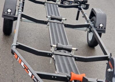 Der Anhänger verfügt über einen feuerverzinkten, robusten Stahlrahmen, der Langlebigkeit und Witterungsbeständigkeit garantiert. Zudem ist er mit AL‑KO oder KNOTT wasserdichten Achsen und Lagern ausgestattet – ideal für häufigen Kontakt mit Wasser. Die Deichsel lässt sich flexibel in der Länge anpassen, und auch die vorgewölbte Achse ist verschiebbar – für perfekte Gewichtsverteilung und variablen Bootssitz. Die klapp- und ausziehbaren Heckleuchtenhalter erlaubt schnellen, werkzeugfreien Umbau bei Bedarf.