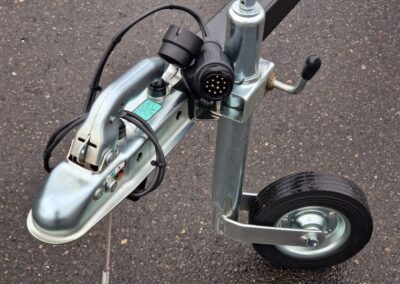 Zur Serienausstattung zählen eine KNOTT-Seilwinde mit Gurt und Haken, ein Stützrad mit Klemmhalter, eine vollständige 13-polige LED-Beleuchtungsanlage und Bereifung in der Größe 155/70 R13. Der Anhänger wird mit einer 100-km/h-Zulassung* und den erforderlichen COC-Dokumenten ausgeliefert.