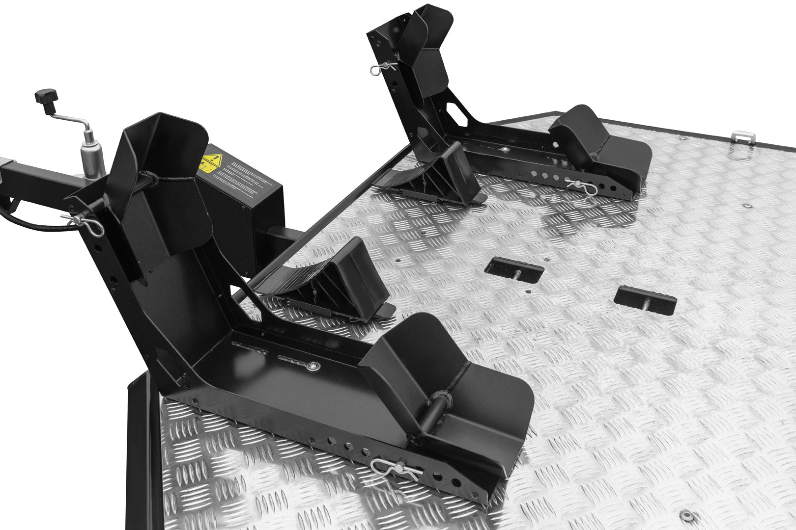 Eine Radwippe hält das Vorderrad senkrecht, was den Ladevorgang vereinfacht und das Motorrad stabilisiert, während es verzurrt wird.