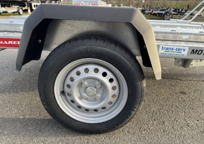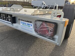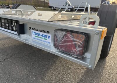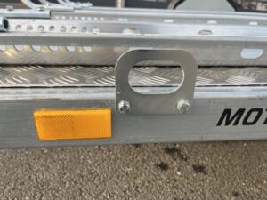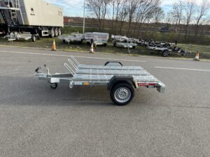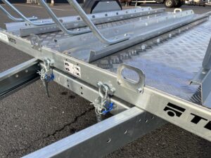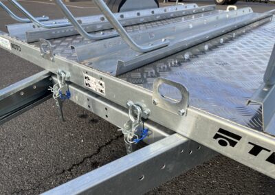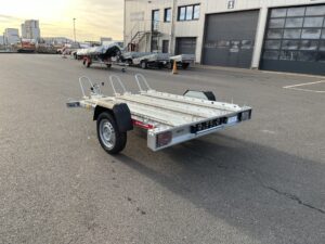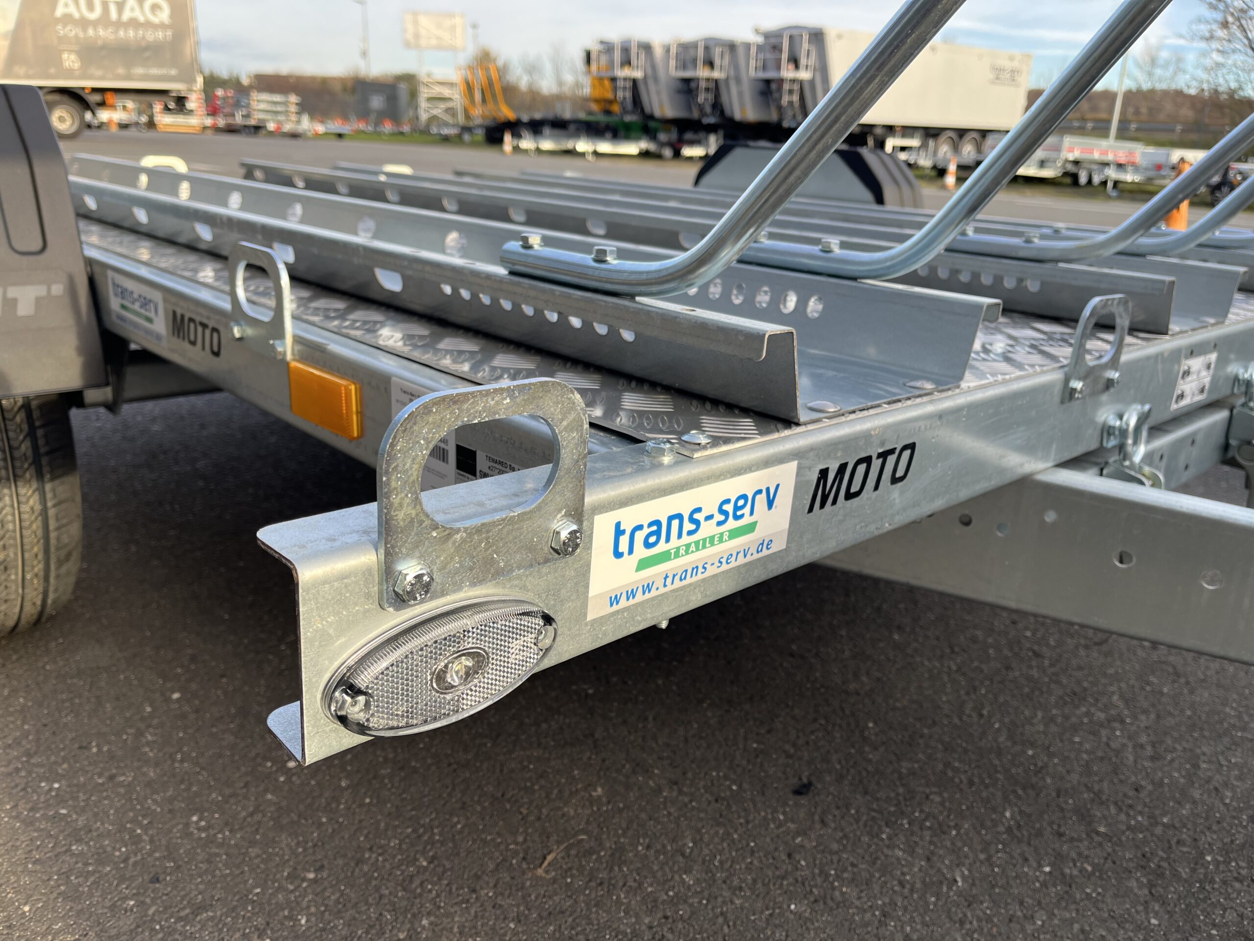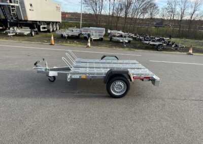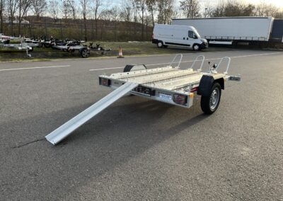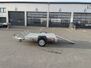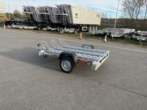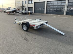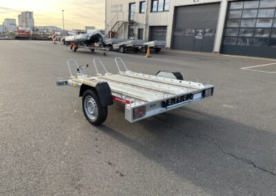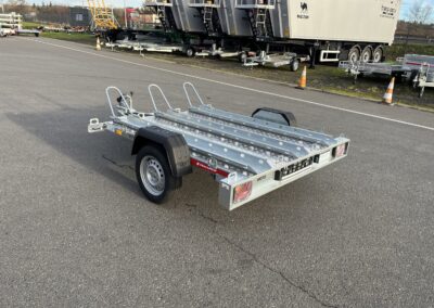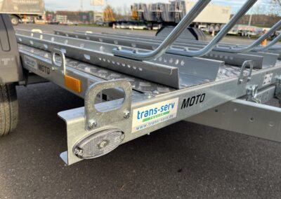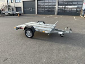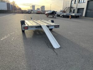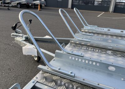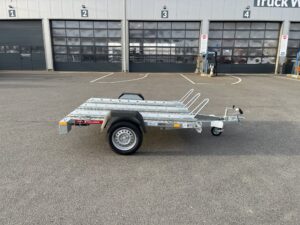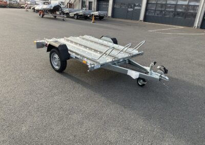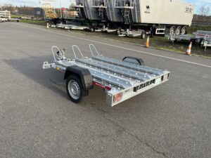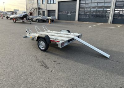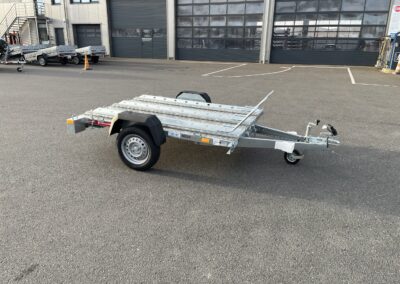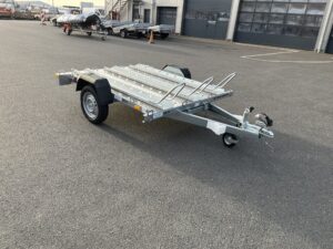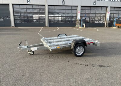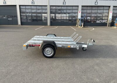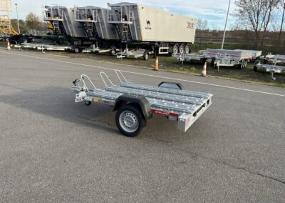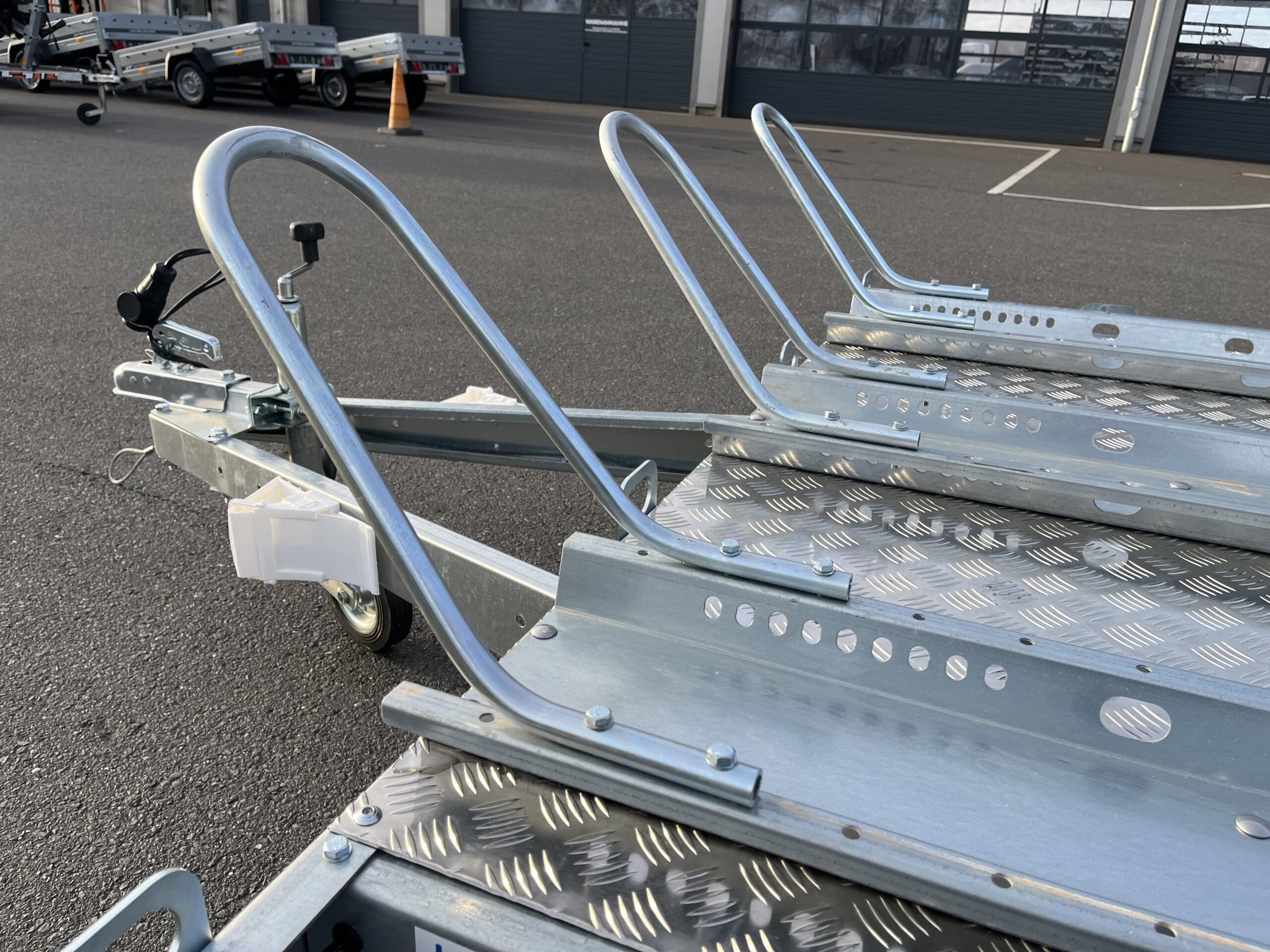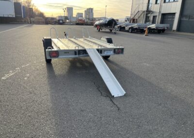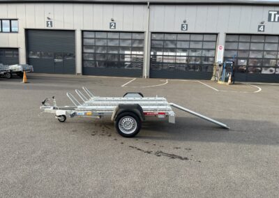 Der Anhänger ist mit drei Führungsschienen mit Bügel und vollem Aluminiumboden (Riffelblech) ausgestattet. Die Verladeschiene ist im Lieferumfang enthalten und wird unter der Plattform verstaut. Zusätzlich ist der Anhänger mit LED Beleuchtung ausgestattet.
